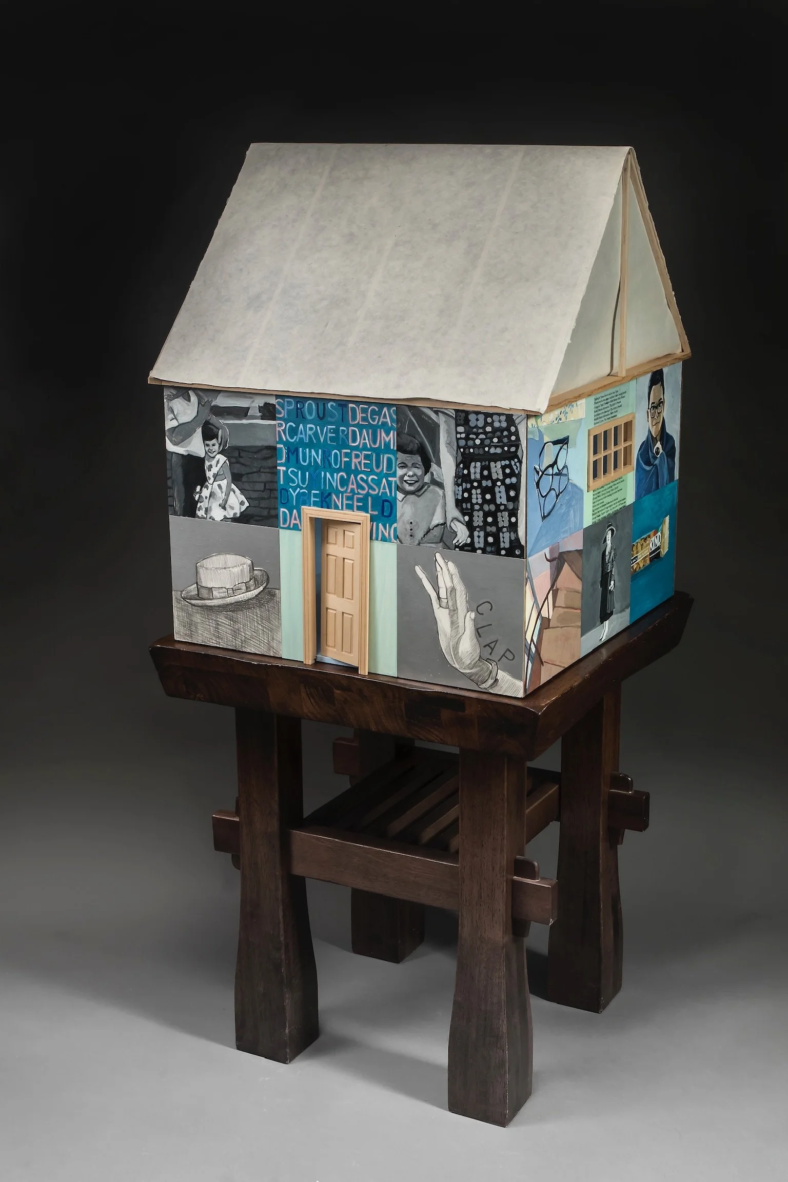 “Zeitgeist 1, “directly challenges the western notion of portraiture as simply a photographic representation. It also serves as the artist’s self-portrait. The “house” is a substitute for the body—-the physical body, a body of work, or of life itself. It refers to the Chinese traditional burial custom of burning a paper house filled with all the necessities one’s loved one will need in the afterlife. The exterior depicts visual “words” and memories as the sum total of the artist’s life. If one peers through the window or door, one can view a ceramic bed on top of which lies a flash drive containing the subject’s voice, thoughts and writings. It was created as a prototype for a future commission.